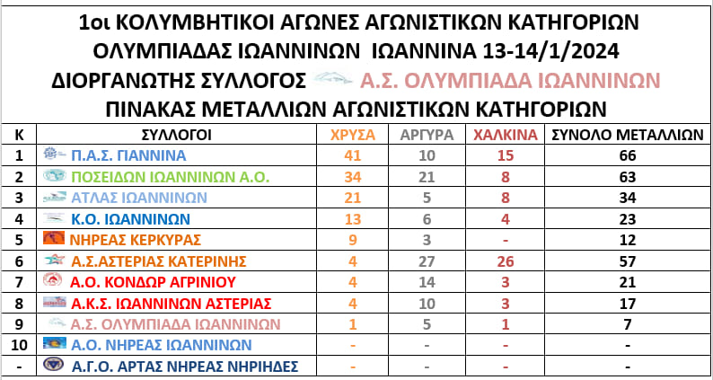 Για άλλη μια φορά ο ΠΑΣ ΓΙΑΝΝΙΝΑ κυριάρχησε στους κολυμβητικούς αγώνες που διεξήχθησαν στο κολυμβητήριο των Ιωαννίνων 13-14/1/2024.
